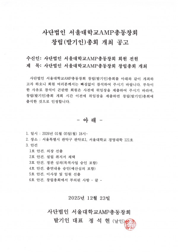 사단법인 서울대학교AMP총동창회 창립(발기인)총회 개최 공고